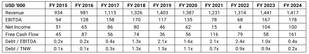 APOG has a solid track record of growth. As of FY 2024, it generated revenues of USD 1.4bn which had gradually increased over the past 10 years. It is profitable and margins have been improving as of recent. It is free cash flow positive generating USD 161m by FY2024 (up from USD 45m in 2015). In terms of its solvency, risk seems to be manageable supported by solid and improving credit metrics: Debt/EBITDA improved to 0.4x in 2024 having peaked at 2.4x in 2022.