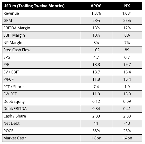 * During my purchase period, the market cap of APOG was lower or on par with NX.